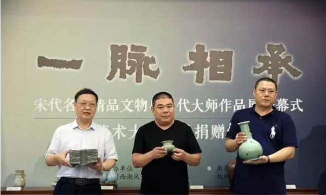 当日上午,《一脉相承:宋代名窑精品文物与当代大师作品展》暨当代陶瓷艺术大师作品捐赠仪式在杭州博物馆举行。杭州西湖风景名胜区党委书记、管委会主任翁文杰等领导向无偿将作品捐赠给杭州博物馆的8位陶瓷艺术大师颁发证书。浙江省文物局、浙江省博物馆学会、杭州西湖风景名胜区等相关领导出席捐赠仪式。