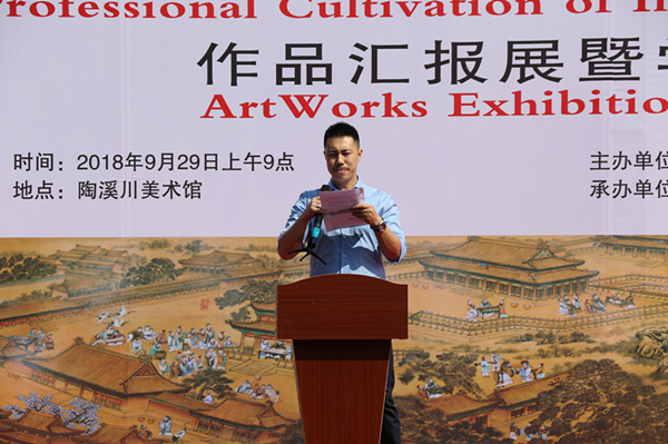 在作品展开幕式上,景德镇陶瓷大学校长宁钢、景德镇学院院长陈雨前、景德镇陶瓷大学周国桢教授、文化部中国文化传媒集团艺术品评估委员会上海工作站主任、国家艺术基金评委陈海波致辞,景德镇陶邑文化发展有限公司副总经理刚好、授课教师代表朱辉球、学员代表刘德欣作了发言。