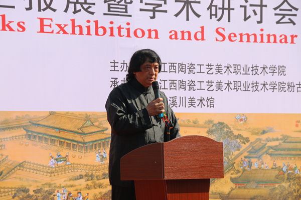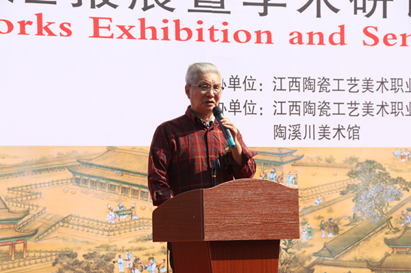 他指出,江西陶瓷工艺美术职业技术学院是以陶瓷类专业为办学特色的国家优质高等职业院校立项建设单位,也是江西省非物质文化遗产传承基地、江西省文化艺术科学重点研究基地。办学60年来,学院立足景德镇深厚的陶瓷文化技艺和人才辈出的优质资源,致力于人才培养、科学研究、社会服务、文化传承与创新,培养了大批高技能应用型陶瓷职业人才,已经成为景德镇陶瓷文化教育、保护、传承、创新的重要阵地。这次《墨彩制瓷技艺人才培养》研修班作品汇报展和学术研讨会既是彰显学院特色办学的重要组成部分,也是学院始终坚持立德树人,服务地方和产业经济,传承创新景德镇陶瓷文化技艺和弘扬工匠精神的生动实践。