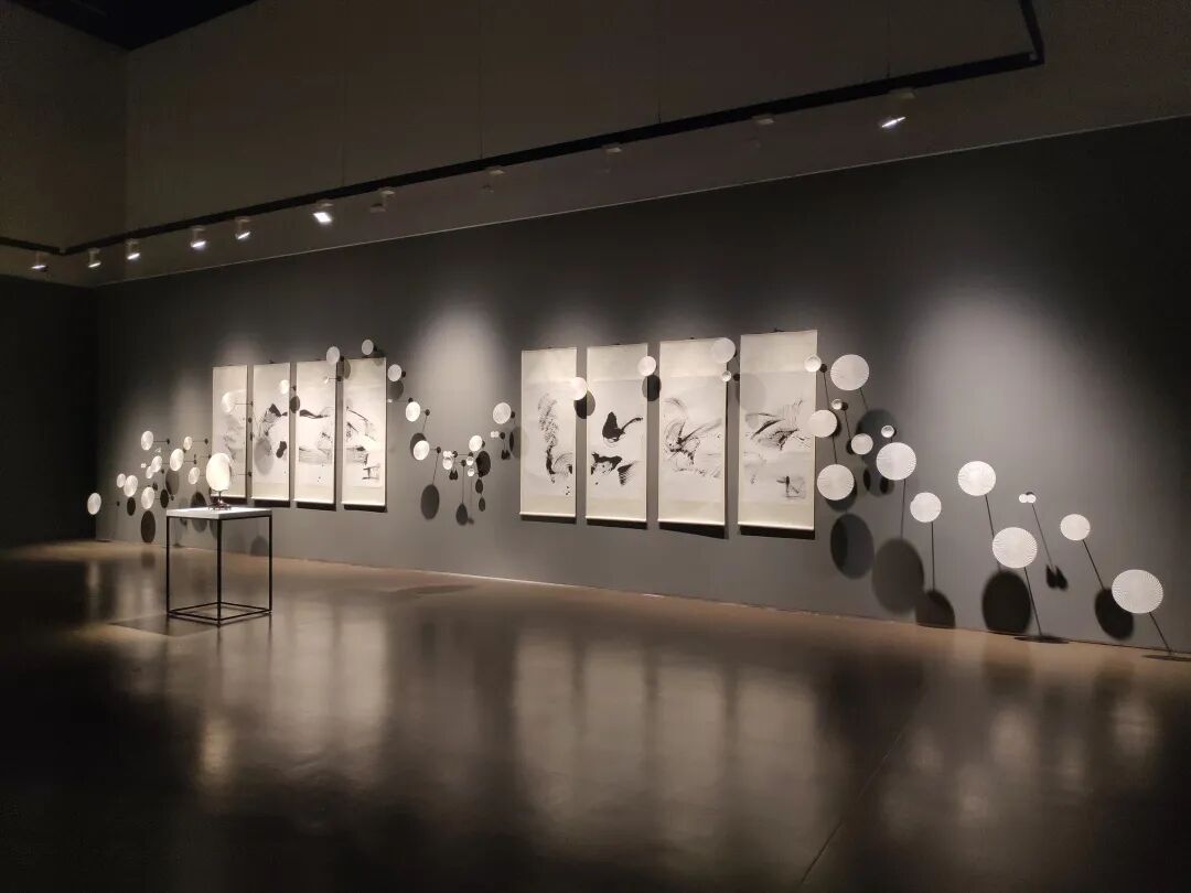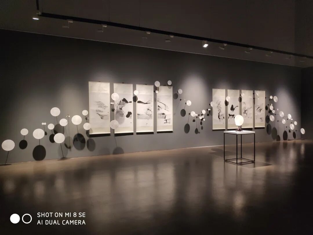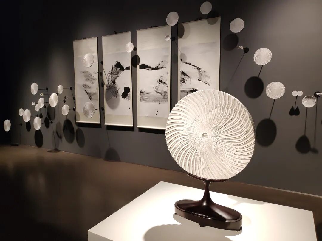 当我们走进艺术宫展览现场,我们的目光立即被一只镶在基座上的白色轮子所吸引,在这件雕塑后面18公尺长的墙上有无数圆盘,圆锥体,握形手印悬浮空中,连同令人惊艳的水墨画一起组成背景。