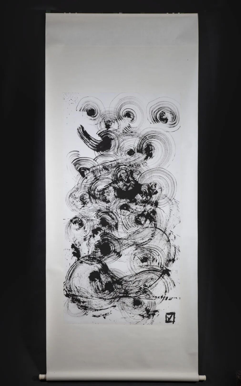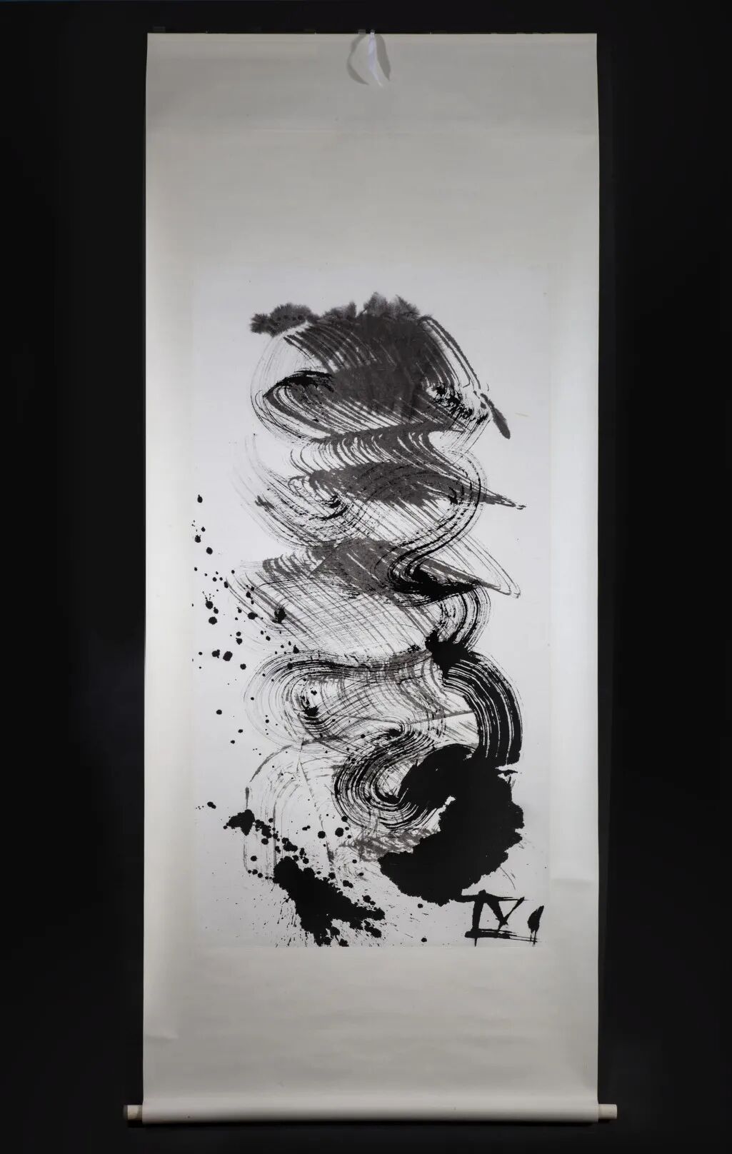 路弗的水墨画,与雕塑视觉互相呼应,创造与破坏的能量似乎也在其中回响。在这里我们看到,洛考所描述的「精湛热情」再次生动展现出来,正像他轮子上的雕刻,敏捷、果断、流畅的水墨笔触,气势磅礡,疾劲猛烈横扫卷轴,把观众推向空中,然而观众接下来却被轻轻放回温润柔和的白里面。这些水墨画,借由路弗庄严绝美协调黑与白之间的反差,彰显出洪荒初始的阳与无限退让温柔的阴之间的对比。创造与破坏带来一种全然绝世脱俗的宁静。那协调扰动却又安顿我们所有的感官——因此,我们的灵魂。就像他的雕塑,路弗用他充满张力的表现手法,带给我们如马瑞欧.库塔加(Mario Cutajar)所形容的,路弗与众不同杰出作品里的非凡精致。3背对着充满活力却又宁静的水墨画,女人肖像的沉默似乎更加没入她的孑然一身之中。但路弗借着协调雕塑和水墨之间的视觉张力, 化解并融合了这两者间的二元分界。在这里,路弗再度「机巧地避开传统的对立语汇」,给了我们超然脱俗。在路弗对李遊宇大师作品充满敬仰的描述中,我们也听到了这超然脱俗的回音,「一种我们从新石器时代中国陪葬玉石上所感受到的环宇空灵」。4
