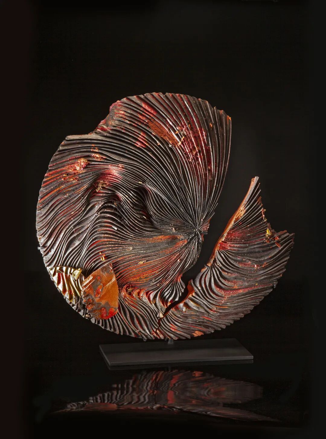 「我们看到马克.路弗的瓷器雕塑和炻器雕塑,虽然尺寸大,但几乎可用精致一词来形容。路弗1962年生于纽约附近,是大学教授。他用他那敏锐的创造性智力,赋予他精巧的作品闪闪发光的诗歌,隐喻了所有材质和形态中的变化。马克.路弗的作品不仅局限于陶瓷,还包括青铜和玻璃雕塑,装置艺术和绘画。他偏好某些造形:一而再再而三回到他那精巧刻画着边缘锐利,辐射状线条的漏斗形,轮形或圆形。
