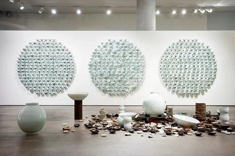 他把放大的断裂匣钵与堆叠的青白瓷相结合,把古与今、大与小、粗与细等对比观念带入了作品。在经过严谨的摆放形成视觉感极强的装置作品,整个作品拥有了宁静亦富有张力的气场,具有很强的仪式祭献感。