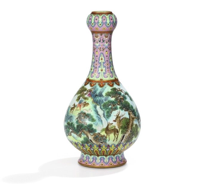A FINE AND MAGNIFICENT IMPERIAL 'YANGCAI CRANE-AND-DEER RUYI VASE'