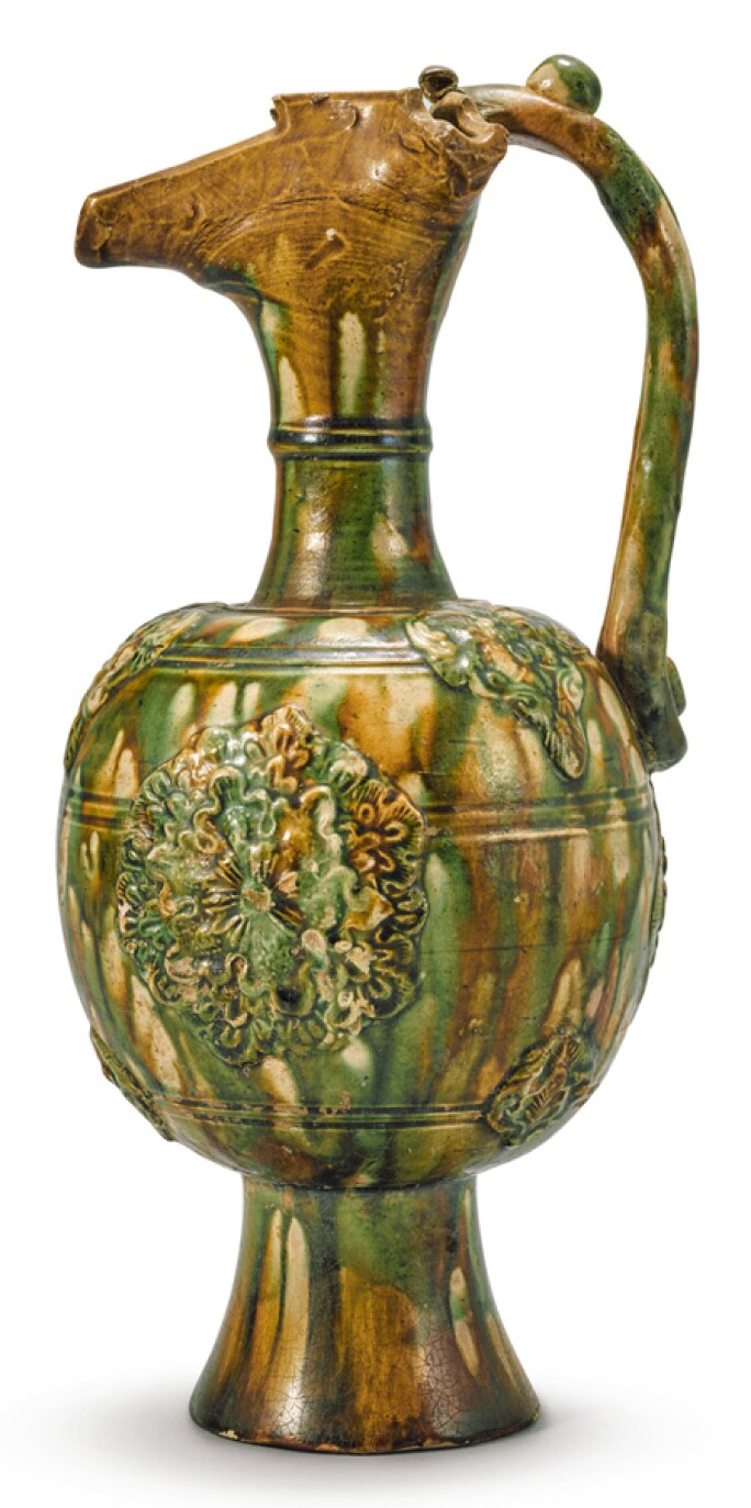 A RARE SANCAI-GLAZED POTTERY EWER, TANG DYNASTY. ESTIMATE $120,000 – 180,000.