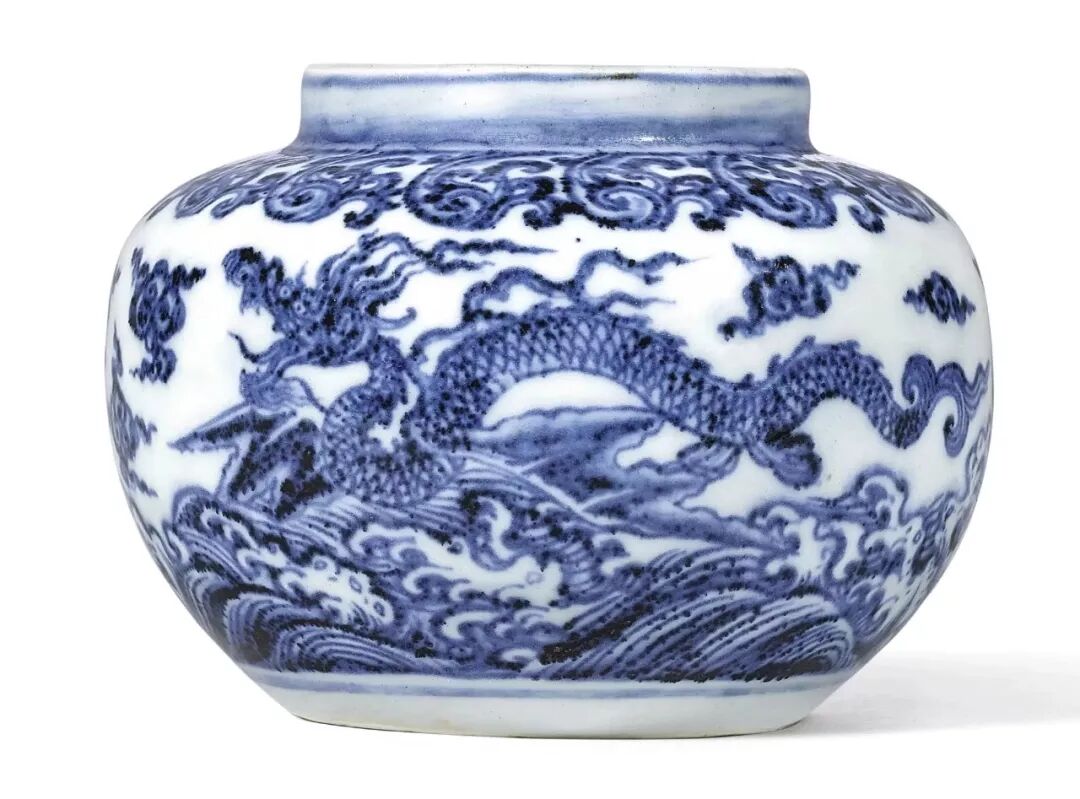 This pot is small and pleasant, and the paintings are powerful and powerful, but they are soft and beautiful. You can observe the elegance and feel the fullness of the pot. It contains the implicit style of the Jingdezhen imperial kiln in the early Ming Dynasty. There are few such small pots, and this vessel may be the orphan of Yongle (1403-1424), which is a gem. The water waves echoed the pattern of the dragon. Although it was fired in the imperial kilns of Xuande (1426-1435) and Chenghua (1465-1487), it was exhausted after that.