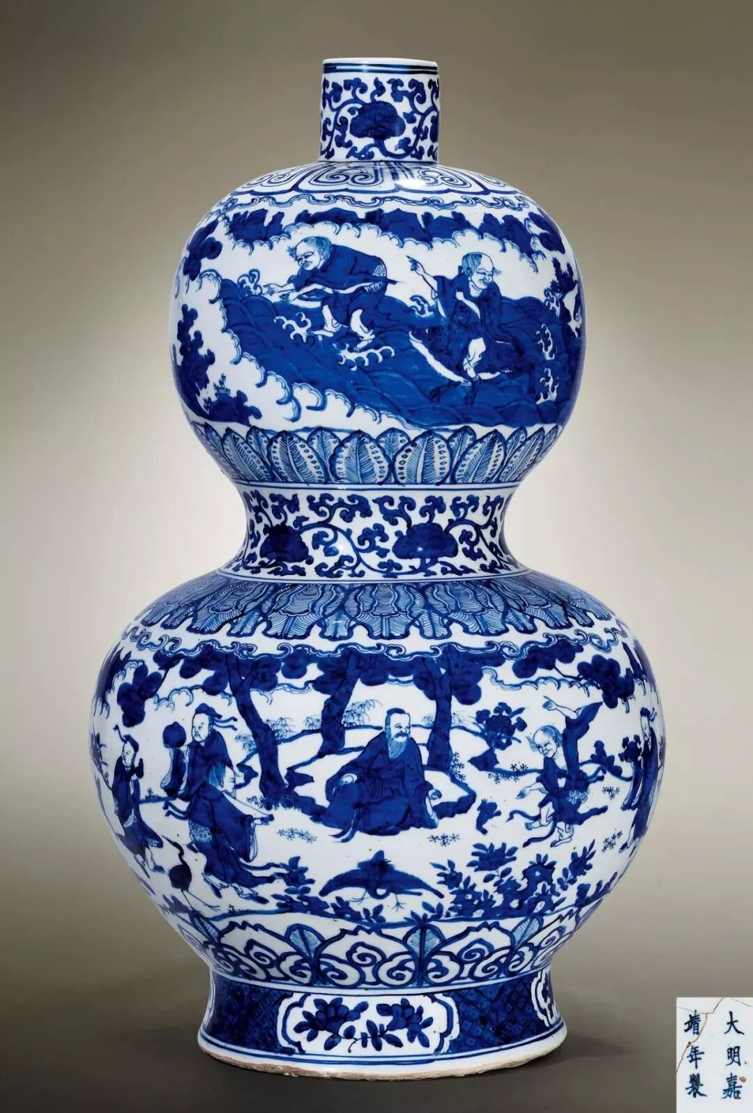 This product is a very rare type of Jiajing imperial porcelain gourd-style bottle. Its upper and lower abdomen are plump and round, the mouth is thin and straight, and the ring feet are high and deep. It is quite heroic and ancient. Its mouth and waist are painted with lingzhi lingzhi pattern, upper and lower abdomen is decorated with deformed lotus petal pattern and banana leaf pattern, the middle theme pattern is the five immortals walking music picture, see the cold mountain lingbo playing in the water, Liu Hai rides the golden toad Take off, pick up and sit with a broomstick, as if talking to the fairy wearing a gourd with a stick, and behind the fairy Matsushita is writing a scroll, with a leisurely look. The theme of the lower abdomen is a happy birthday picture of a group of immortals. The scene is very lively and there are a total of 13 immortals celebrating birthdays. Seeing the birthday star sitting on the stone, he is contented, watching the bangs play the toad, all the immortals present their birthdays, seeing those holding ganoderma lucidum and peaches, holding aquariums and beating fish drums, blowing purple flutes and singing jade boards, and the atmosphere is endless and festive. Peaceful. The outside of the circle foot is brightly painted with branches and fruit patterns. Its blue and white colors are thick and purple, which are typical characteristics of Huiqing. The paintings are complicated and meticulous, and the manners of the immortals are different. They are vivid and lifelike. Each is wonderful, especially the cold mountain. It is very similar to the "Han Shan Shi De Tu" made by the painter You Qiu during the Jiawan period, which shows that the painting technique is extraordinary. The base script "Da Ming Jiajing Years" in regular script is naive and primitive.