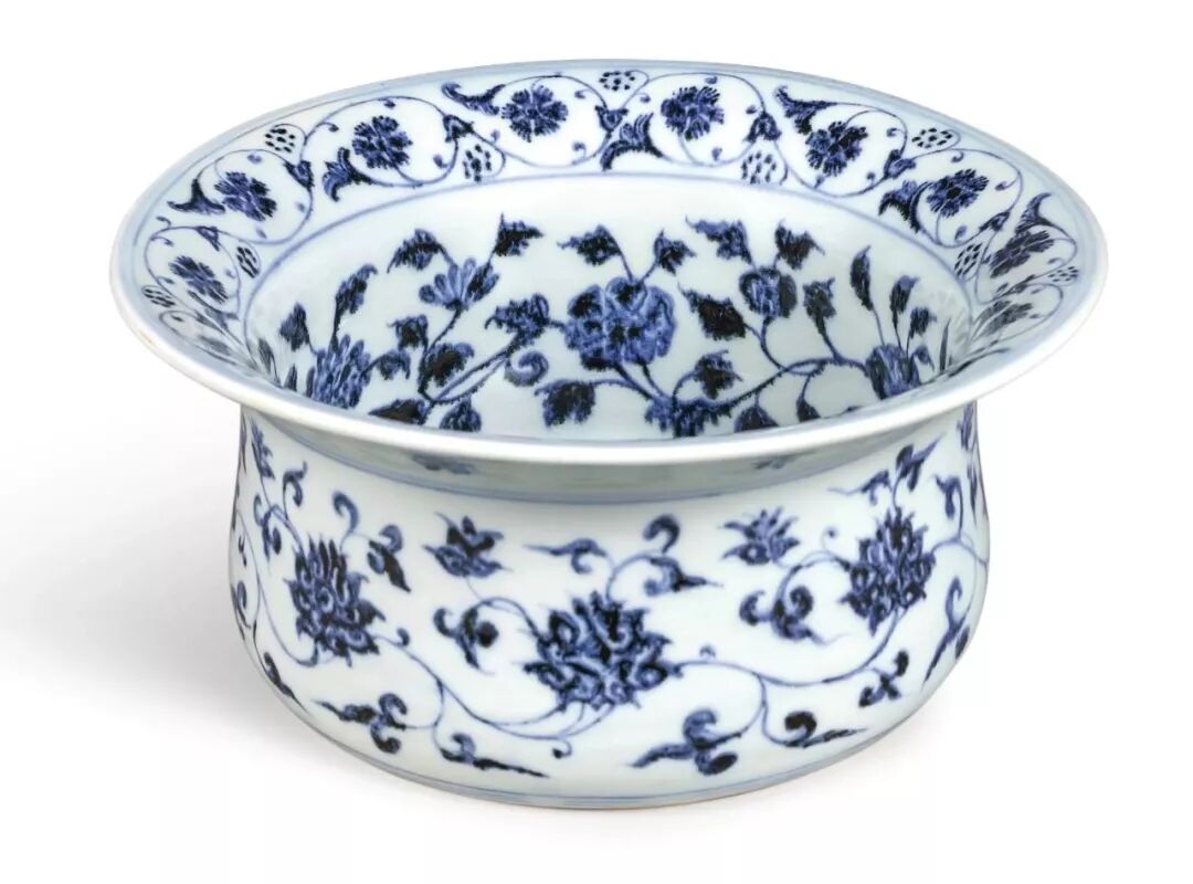 The pattern on the heart of this fold along the basin is abstract and unique. It is the only example of the decorative pattern. Its edges and corners are sharp and straight, and it is considered rare. During the Yongle period (1403-1424), the Jingdezhen imperial kiln was inspired by Islamic artifacts, and created and burned a series of imperial porcelains with different shapes and decorations. This product is one of the best examples. See proof of the important innovation in the history of ceramic development in the DPRK (1368-1644). This basin has a flat bottom, deep and straight walls converging from bottom to top, and wide folding edges. Like many Yongle porcelains, its shape is obviously not naturally derived during the drawing process, but created by Middle Eastern metalsmiths.