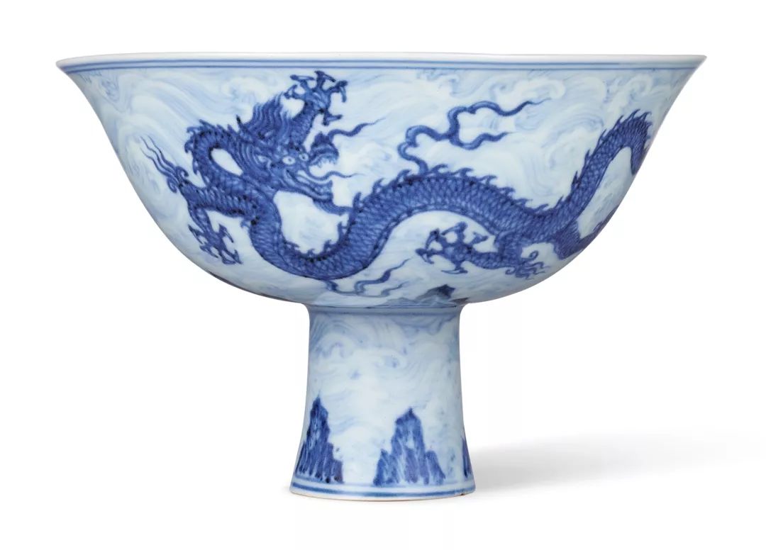 This lot, along with the TOP1 lot on the annual list-Qing Qianlong dynasty yellow ground painting enamel phoenix dance peony furoshiki bottle, appeared in the 2019 Hong Kong Sotheby's Autumn Auction, and was hammered at a high price of 67.99 million! This bowl is mouth-smooth, tall and luxurious. Outside the bowl, the five-clawed double dragons are beautifully painted, with a vigorous body and dense scales, with different expressions, one head up, one looking back, facing away, swimming in surging surging, majestic and majestic. On the Xiushu, lightly painted waves and swaying waves, meeting the strong blue and fierce dragon, combining strength and softness, superb, all in depth and light. Except for this high-footed bowl and a few similar cases, there is almost no other decorative pattern in Xuande blue and white porcelain, which can fully demonstrate the ingenuity of the Jingdezhen porcelain masters at that time.