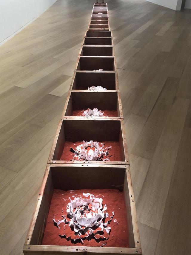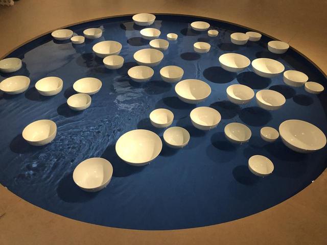 出自法国艺术家塞莱斯特·布谢-穆日诺之手的作品《无题》极为引人注目。一池蓝色水波中,漂浮着大小不一的白色瓷碗。碗随水波漂弋流转,于碰撞中发出清悦的声音。形、色、声巧妙融于一体,美感飘逸灵动,一气呵成。艺术家一直坚持做能用物理力量发出声音的作品。《无题》的声音不仅来自瓷碗的摩擦和碰撞,事实上,水泵、水流和瓷碗之间有一个明确的“部署”,它们之间的运作,成就了整个“作曲”过程。塞莱斯特说:“我选用了骨瓷碗,这是很多人每天都会用的碗,非常日常。我想借此表达,日常物也可以成为乐器,弹奏出美妙的声音。希望大家漫步在其中,在声音与视觉艺术之间找到一种自然与人工的平衡点。”