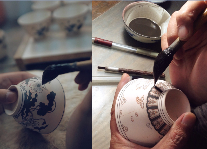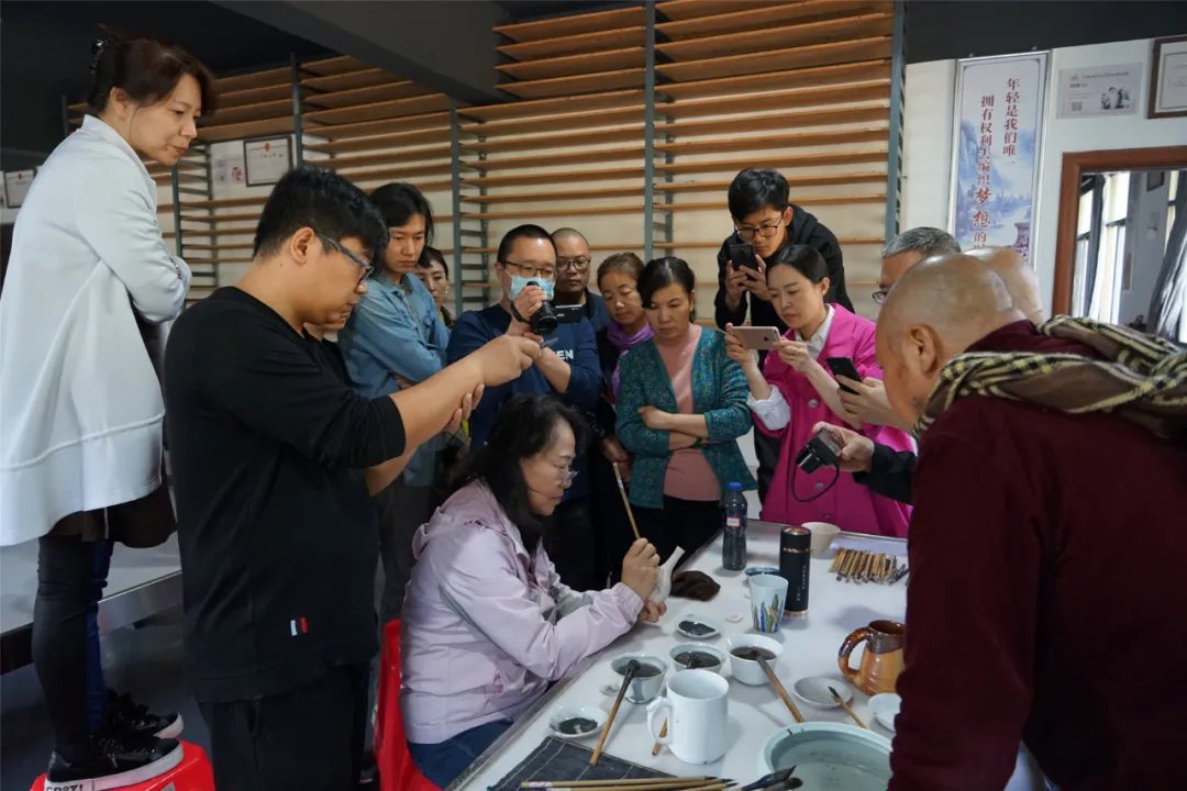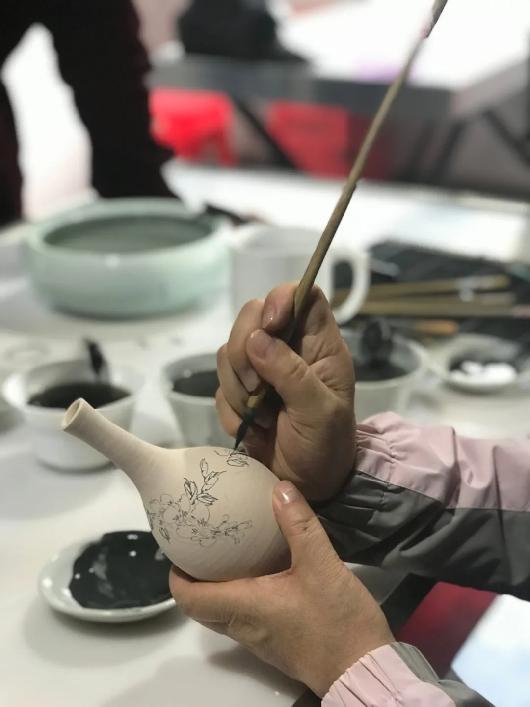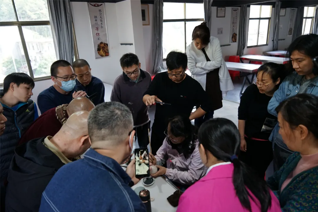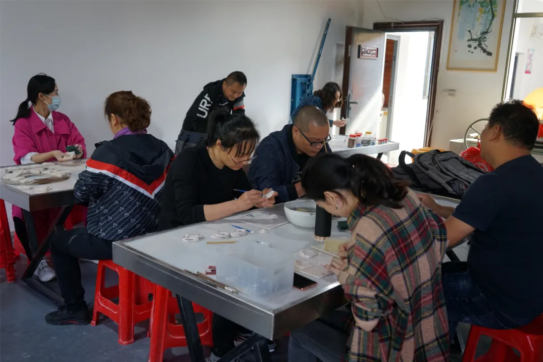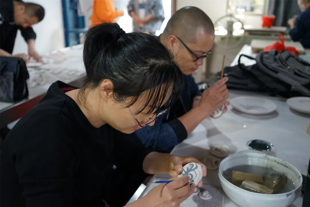 下午,於彩云老师为学员们做了青花分水示范,并详细介绍了料水的调配、分水的技法步骤,以及釉色使用的注意事项等。