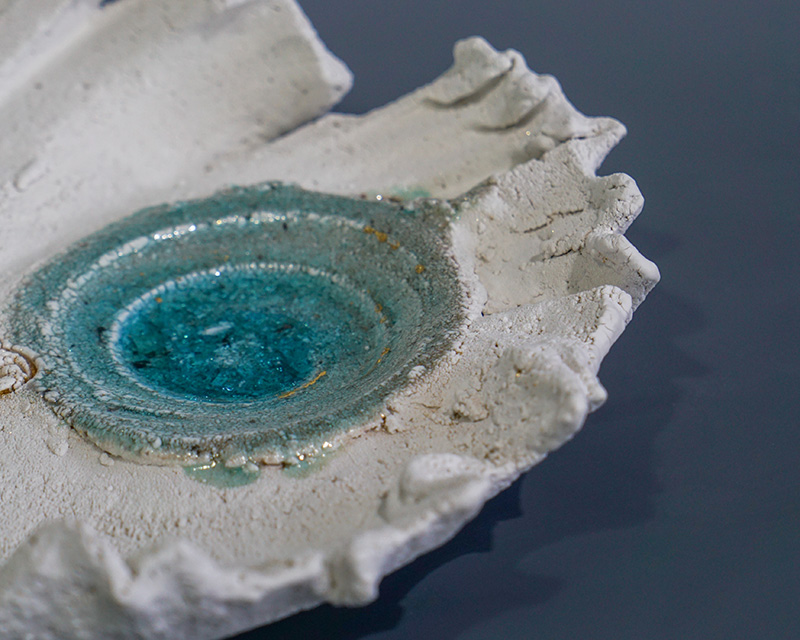 我关心如何在作品中体现切割造型如水般的流动感。在去青海旅行的过程中,茶卡镇盐湖的宁静美吸引了我。走在雪白的盐层表面,看着尚未结晶的湖面映射着余晖的光彩,微风轻轻吹过湖面,那一刻静与动融合的美留在了我的心中。我希望将余晖的美留在我的作品中,这是《原》系列作品的灵感来源。