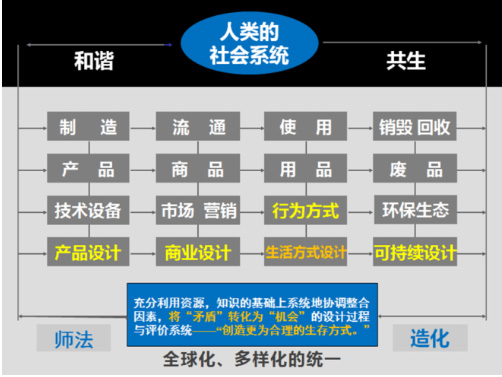 人类社会的基本模型是以“经济、科技、文化”为支撑,然而“文化”内涵由于人类认识到生存必须依赖于“自然”,又逐渐上升认识到作为社会的人类必须将“生态观”充实到人类社会的模型中。人类在社会进化中从“格物”到“致知”,又从“致知”到“格物”的循环上升中逐渐懂得社会价值观和生存战略——“方法论”的重要,即“目的”——“路径”——“策略”——“方法与技术”——“工具”之间的逻辑。设计不能仅跟随市场、满足市场,要看到这个世界发展的真正需求,从而定义需求、引领需求、创造需求。人们已开始将工业设计的实践与认识提高到“机制”创新、生活方式设计、文化模式设计及系统设计层面上了,现在又致力于可持续发展的“集成式系统整合”的协同设计——“社会设计”的高度上来了。“服务设计”诠释了“工业设计”最根本的宗旨是“创造人类社会健康、合理、共享、公平的生存方式”。