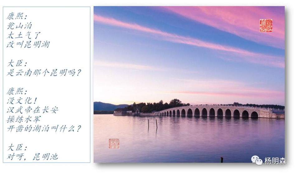 既然身份变了,就应该改个与身份相称的名字。康熙一向崇拜汉武大帝,想起汉武帝在长安开凿昆明池操练水军的故事,就把瓮山泊改名为昆明湖。