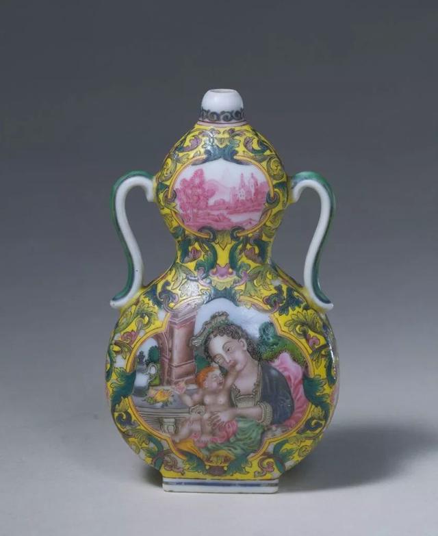 黄地珐琅彩开光西洋人物纹绶带耳葫芦瓶