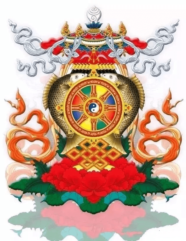 金鱼,佛陀的眼睛,藏语称“赛涅”,又称黄金鱼。鱼行水中,畅通无碍。佛教以其喻示 超越世间、自由豁达得解脱的修行者。藏传佛教中,常以一对金鱼象征解脱的境地,又象征着 复苏、永生、再生等意。