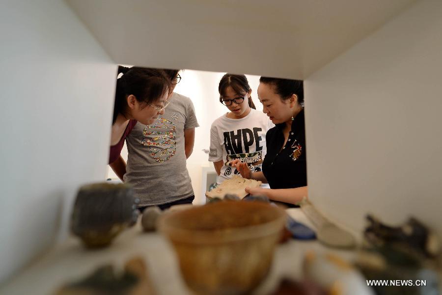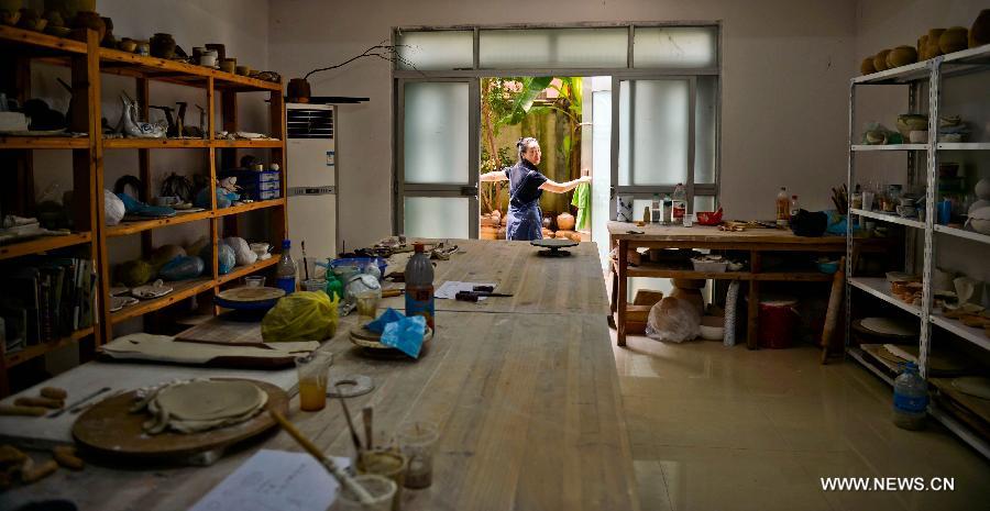 Zhang Lingyun meets a British ceramic artist at a cafe in Jingdezhen, east China's Jiangxi Province, July 17, 2014.