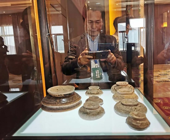 图说:与会代表现场参观刻划有类希腊字母的古陶瓷