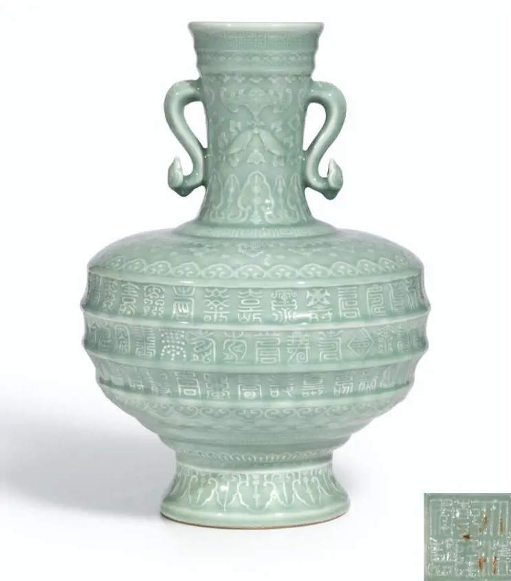 此「百寿」瓶,由著名督陶官唐英监烧,其青釉朗润,形制珍罕,浮雕细腻,满寓庆寿美意,非凡超绝,展现景德镇御窑厂之精卓制瓷技艺。