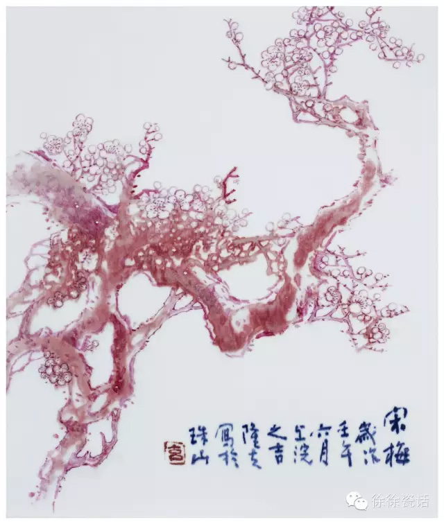 说到父亲的作品以及他的创作历程,又不得不提到我的母亲夏胜兰。母亲长期与父亲合作共事,父亲画的瓷器基本上由她完成填色,她对粉彩的设色是非常考究的,譬如对于冷色调与暖色调的对比统一关系等等,她都把握得十分精致。母亲早年在景德镇瓷厂工作,后辗转到胜利瓷厂、宇宙瓷厂、新光瓷厂,长期从事高档艺术瓷的填色,施于人教授、郭文莲教授的作品她都曾参与设色。小时候,老是看到她手不离磨砵,颜料在她手上磨得格外细嫩,她在玻璃白表面上填色的牡丹花,通体透亮,犹如在光合作用下的渐变效果,过渡十分自然。父亲的早期作品如《十八学士》、《八仙过海》等瓷板条幅,大多是由母亲配合完成的佳作。这些作品至今仍在流传,并广受赞颂。