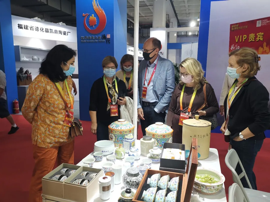 此次到访的大使夫人分别是丹麦大使夫人克莉丝汀·布罗内尔、马达加斯加大使夫人拉迪洛夫·马赛尔、罗马尼亚大使夫人科瑞娜·黛安娜·康斯坦丁内斯库、瑞典大使夫人帕特里克·奥海默、阿尔及利亚大使夫人布卡埃尔法·左拉卡、爱沙尼亚大使夫人杨妮卡·乌甘、冰岛大使夫人多米妮克·易卜生、马耳他大使夫人安·阿奎丽娜、印度大使夫人多莉·米斯里、巴西大使夫人安德烈娅。大使夫人们在中国陶瓷工业协会副理事长、展览会组委会办公室主任董博陪同下参观各个展区欣赏精美的陶瓷日用品和工艺品,感受中国传统陶瓷文化的精妙。在德化展区流连忘返,惊叹德化白瓷的创新设计和优质手感。在中国工艺美术大师赖德全大师的个人作品专展区,赖大师与各位大使夫人分享创作感悟,热烈交流,探讨陶瓷艺术创作,了解陶瓷制作工艺。看到丰富的陶瓷制品,大使夫人纷纷表示,对中国的文化,有着很大兴趣的,也希望未来能多多的了解和学习中国文化。