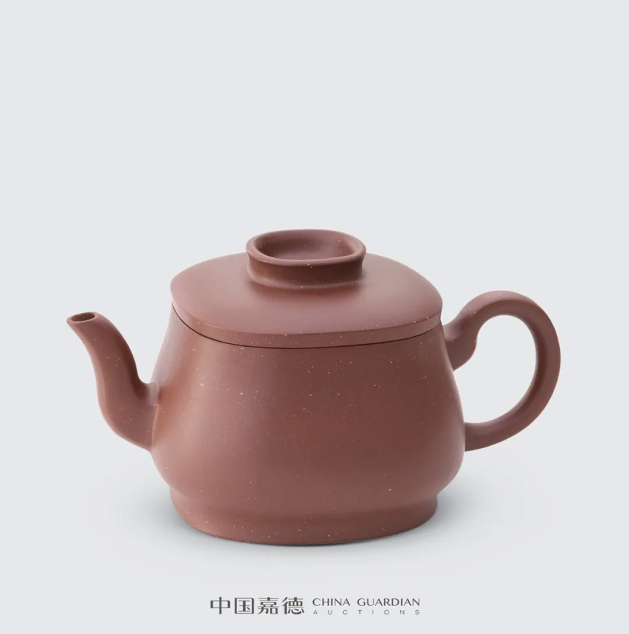 当代工艺美术大师高振宇先生特为本场拍卖创作的金簋壶,与另一位当代大师汪寅仙制1990年署款鸣远弯把梅桩壶同样以57.5万元的成交价占据本场榜首,两件清早期紫砂美器紧随其后,“春水堂制朱砂具轮珠壶”以55.2万元成交,“惠逸公制林老先生清玩甲辰款朱泥思亭壶”以47.15万元成交。