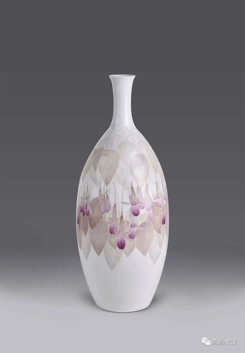 此件作品造型为国家级非遗代表性传承人陈扬龙先生早年设计,撇口、细长颈,腹部微曲修长,脂玉泥制作,醴陵窑核心技艺“薄施淡染”技法绘制。作品用色彩、线条把主观感受呈现为一幅和谐的画面,雅致的灰调是近年的实验成果,亦是心灵的外化。