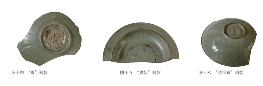 少量标本还带有釉下或釉上刻款,如“御厨”、“后苑”、“殿”、“贵妃”、“慈宁殿”等(图十一至图十六)。