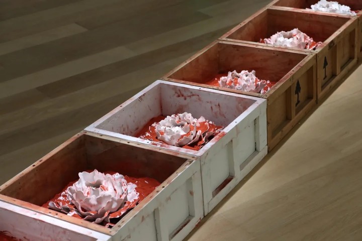 Chen Xiaodan’s Bloom: Line Series 2007 No. 11 lies between “Body and Identity” and “Synesthesia and Nature.” Large white peonies bloom in a series of wooden boxes arranged in a line. The peonies are made of Jingdezhen high white (gaobai) porcelain, which is hand-sculpted and fired at 1,300 degrees. The flower petals are extremely thin, beautiful, and fragile. The connection between flowers and women’s identities is further intensified by the red mineral pigment scattered among the flower petals. The gorgeous red has instinctive associations with fire and blood. For Chen Xiaodan, this work does not need to be explained with more texts or words. She hopes to communicate with viewers through intuitive visual sensations that resonate on a vital level. She says, “Regardless of the circumstances, life instinctively and tenaciously seeks to survive.”