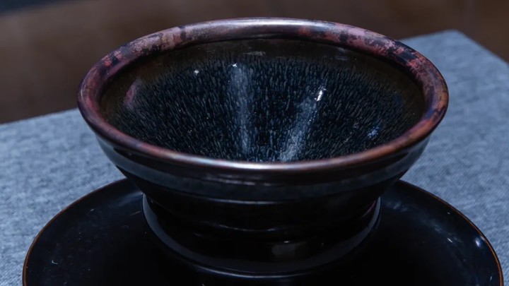Zhao Zhao’s World (left, right), Constellations (center), and a Song dynasty Jian ware black-glazed bowl with hare’s fur decoration and a bronze rim from his collection at Pearl Art Museum’s “From Clay to Words: Ceramics as Media”