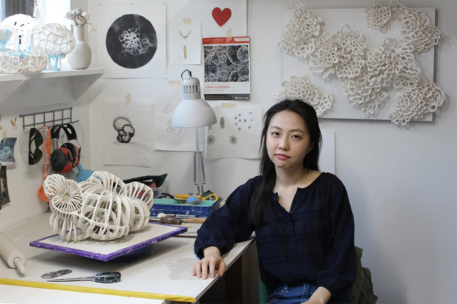 我的雕塑会展现出脆弱/坚硬,简单/复杂,秩序/乱序,规则/不规则,坚硬/柔软这些对立的特质,想要表现微观世界这些生命体简洁多变的形态以及它们精巧的结构美感,让观众能感受到那个隐藏着的另一个世界。《生长和形态》一书中,“物体的形态像图表一样展示了相互作用的各种力”。我感兴趣的这些生物结构,记录了它们在生长、扩张、消亡过程中受到自身的生长力,同时和外界空间、环境和时间所形成的外力的相互影响。一直适应、改变、进化出无限的新形态。微生物作为最基本的生命体也是高级生物的缩影。通过创作我思考生命的生长状态,微观和宏观世界,思考自己的经历,将自己日常的观察和感受,加上一部分的想象,编织到作品抽象的线条当中。在美国待的时间越长,越会慢慢明白自己拥有的中国文化背景的可贵和独特。在作品里添加一些元素,比如用中国陶艺传统的色调,例如青花的蓝和白,青釉的绿,展现对自己的身份认同。