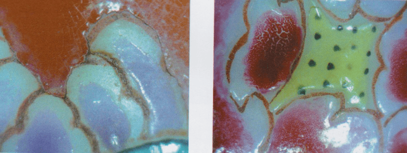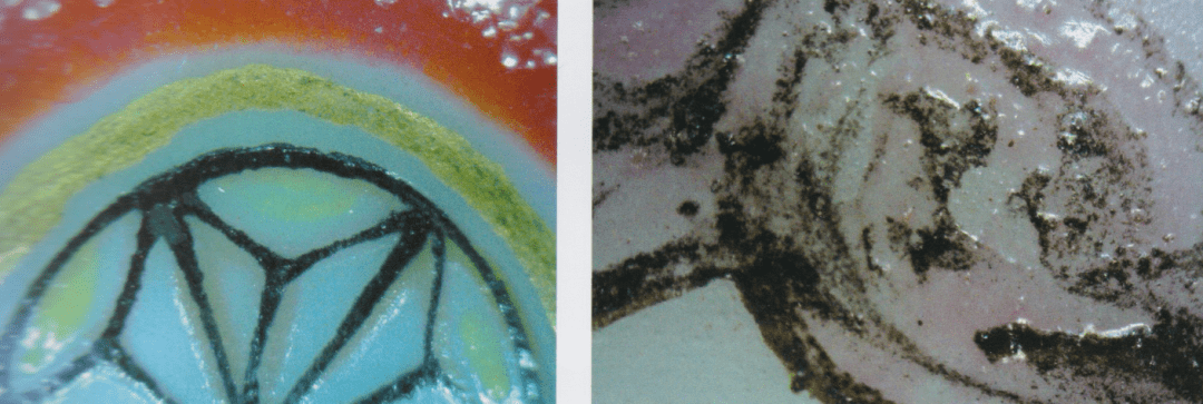 经显微放大五十倍后,清楚可见团花以烧金珐琅框边,团花内部可见涩胎裸露。红色地多坑洞,亦说明探涩胎上施红料的做法。粉色灵芝以金红玻璃裂成珐琅料上彩,在显微放大两百倍下,可分别观察到未熔解的红玻璃颗粒与金微米颗粒。