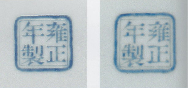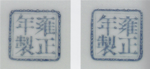 这对碟侈口、浅弧壁、矮圈足。器内平素无纹,釉色略带灰黄。二碟器外璧以蓝色马地,彩绘梅树一株,其上开满白梅。器底带「雍正年制」二行蓝料宋体字双方框款。
