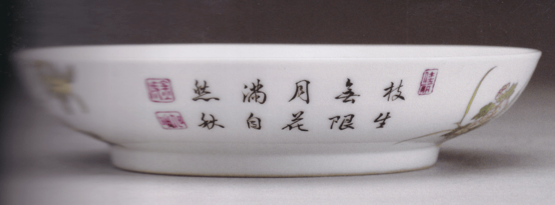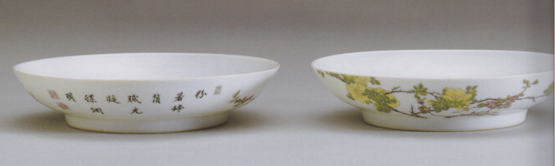 这对碟敛口、浅弧壁、矮圈足。器内平素无纹,二碟器外壁一面以赭墨绘湖石,四周并有竹、月季花、灵芝及野菊。外壁另-面以墨书写有「数枝荣艷足,长占四时春」诗句,其中前一句取自宋朝韩琦《月季花》一 诗,后一句则摘自明朝张新《月季花》七言绝句的尾句。诗句前有「凤采」, 后有「彬然」(白文)、「君子」共三枚红料印。器底带「雍正年制」二行蓝料宋体字双方框款。