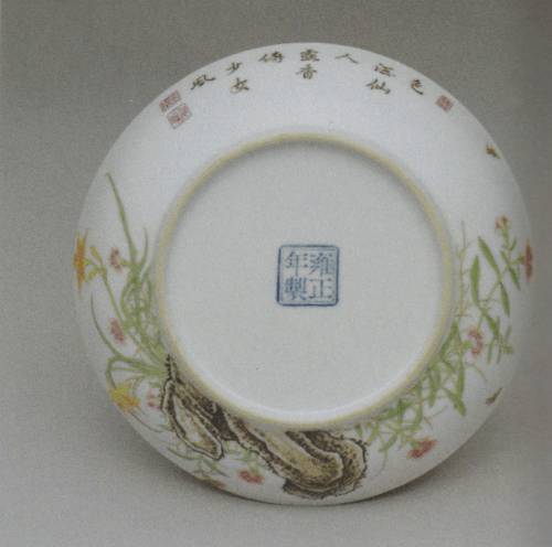 这对碟敛口、浅弧壁、矮圈足。器内平素无纹,二碟器外壁一面以赭墨画湖石,石旁开有黄色萱花及剪秋罗(石竹),并有二双蜜蜂飞舞其间。另面以墨书写有「色湛仙人露,香传少女风」诗句,二句引用自唐朝李峤<萱〉五言律诗之颈联。诗句前有「佳丽」,后有「金成」、「旭映」共三枚红料印。器底带「雍正年制」二行蓝料宋体字双方框款。