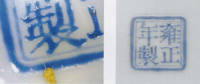 经显微放大两百倍后,可观测到梅花花瓣与蓝地之间的间隔无透明釉,说明此件作品马涩胎上彩绘珐琅料。