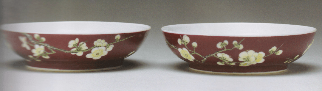 这对碟敛口、浅弧壁、矮圈足。器内平素无纹,器外壁施红地,其上绘梅树一枝,并满开白梅花。器底带「雍正年制」二行蓝料宋体字双方框款。