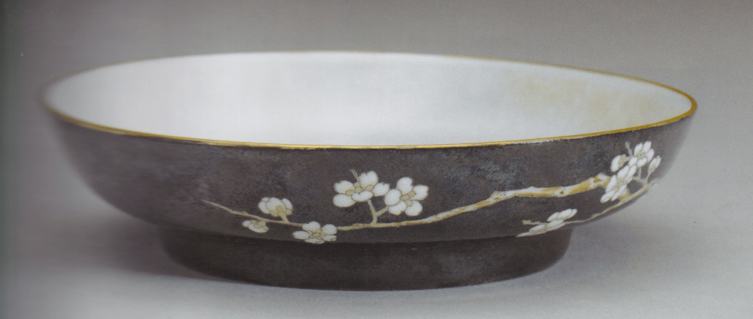 这对碟侈口、浅弧壁、矮圈足。器物口沿涂有一道金边,器内平素无纹,釉色略带灰黄。二碟器外壁以黑色为地,彩绘梅树一株,其上开满白梅。器底带「雍正年制」二行蓝料宋体字方框款。此对瓷碟可能马雍正十年八月十二日造办处档案中画得知「画黑地白梅花四寸磁碟一对」。
