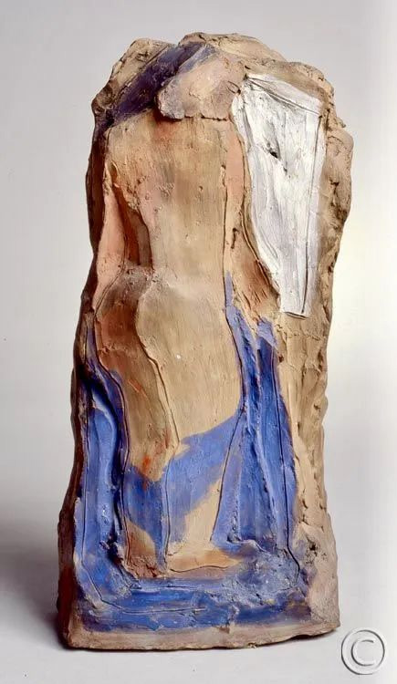 1930年代是丰塔纳陶艺创作的开始,最早的陶瓷创作可以追溯到1931年,为抽象陶土加绘画的作品,有《黑人 1931》《人在窗户中 1931》《水手的恋人 1931》《躺卧的女人 1931》等。在陶艺创作中,丰塔纳手法更加抽象与自由,他尝试将绘画与雕塑做深度的融合,并凸显未完成的张力状态,凸显创造者的情绪与情感。我们看不清具体的形象,更多的是材料与形体色彩本身的语言在迸发、在碰撞。