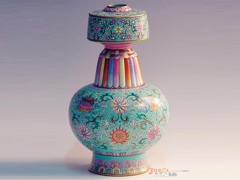 清代乾隆粉彩绿地八宝喷吧瓶由于佛教陶瓷相较贵重金属而言成本较低,易于塑型烧造和保存等...