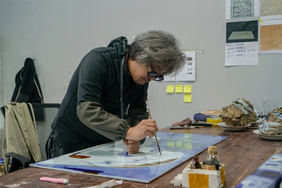 A man makes porcelain at the exhibition in Beijing. Photo: C...