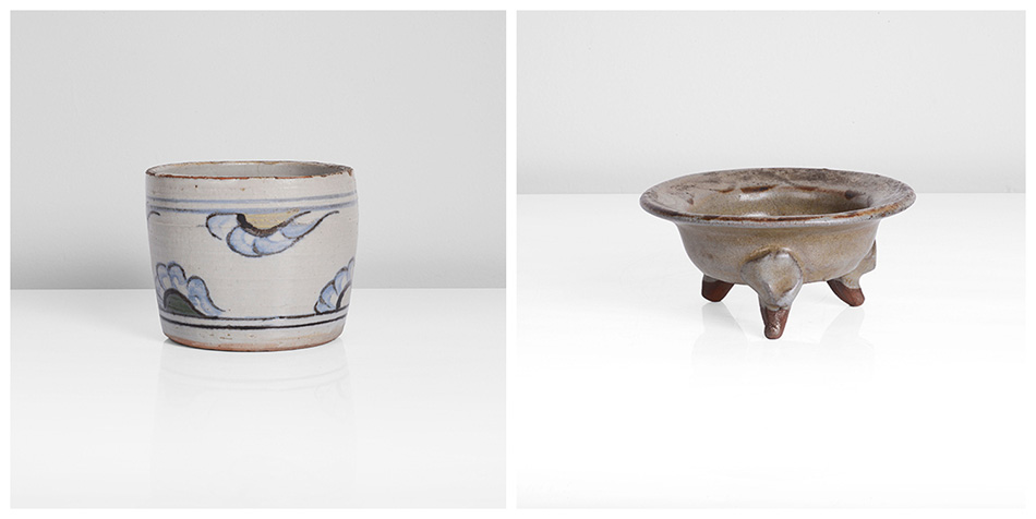 - Fourt image: Lot 17 – Bernard Leach (British, 1887-1979) Rare Early Small Pot, circa 1912-20 and Lot 35 – Hamada Shoji (Japanese, 1894-1978) Small Footed Bowl, 1923