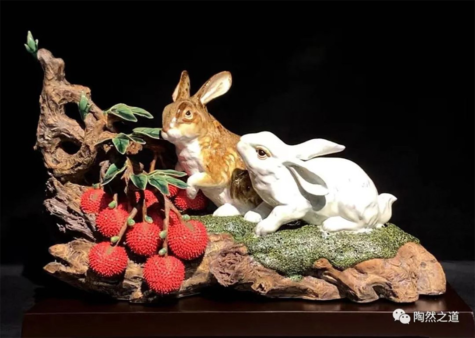 作品《情如荔蜜》(限量150件,长50宽27高35cm)——堪称完美的三角形构图中,演绎出一对灵兔情深款款奔赴甜蜜生活的画面:粗犷的...