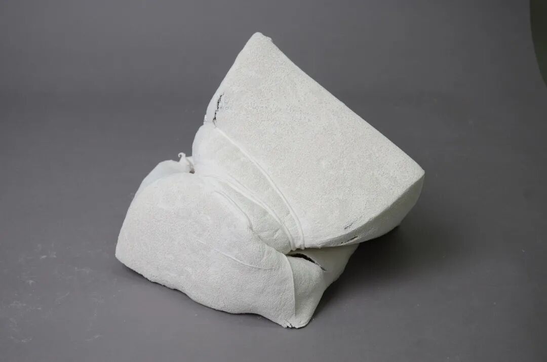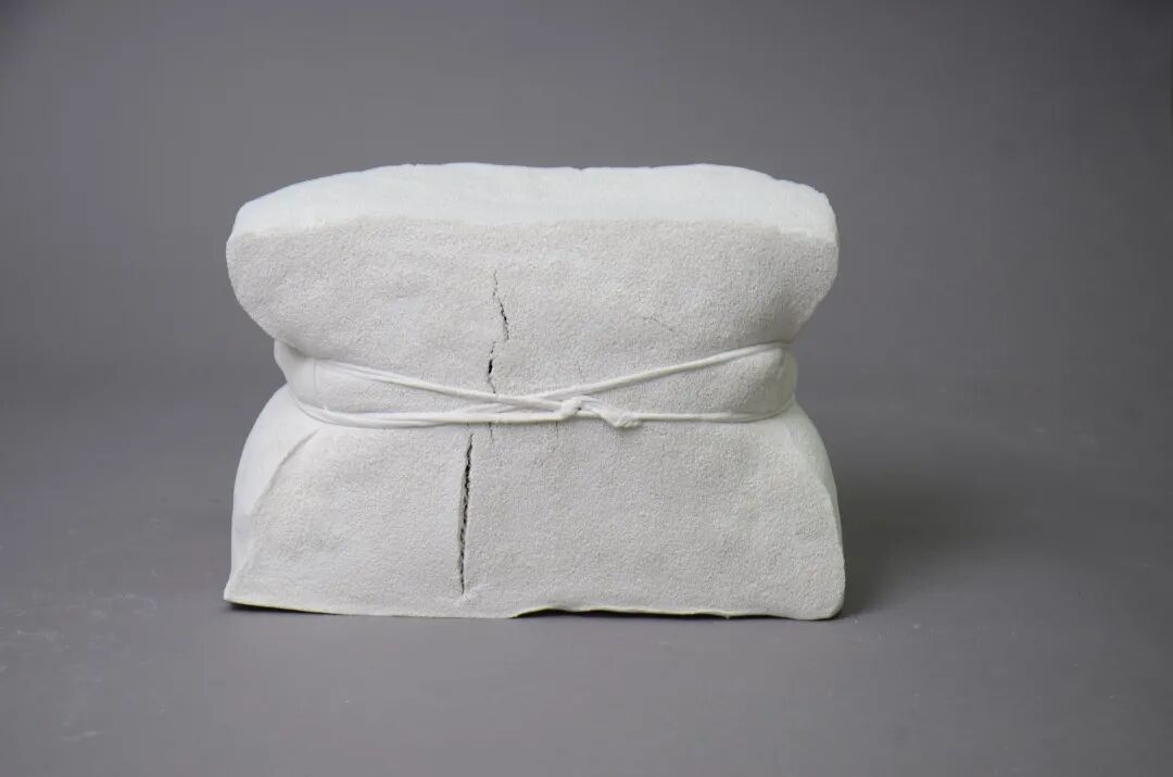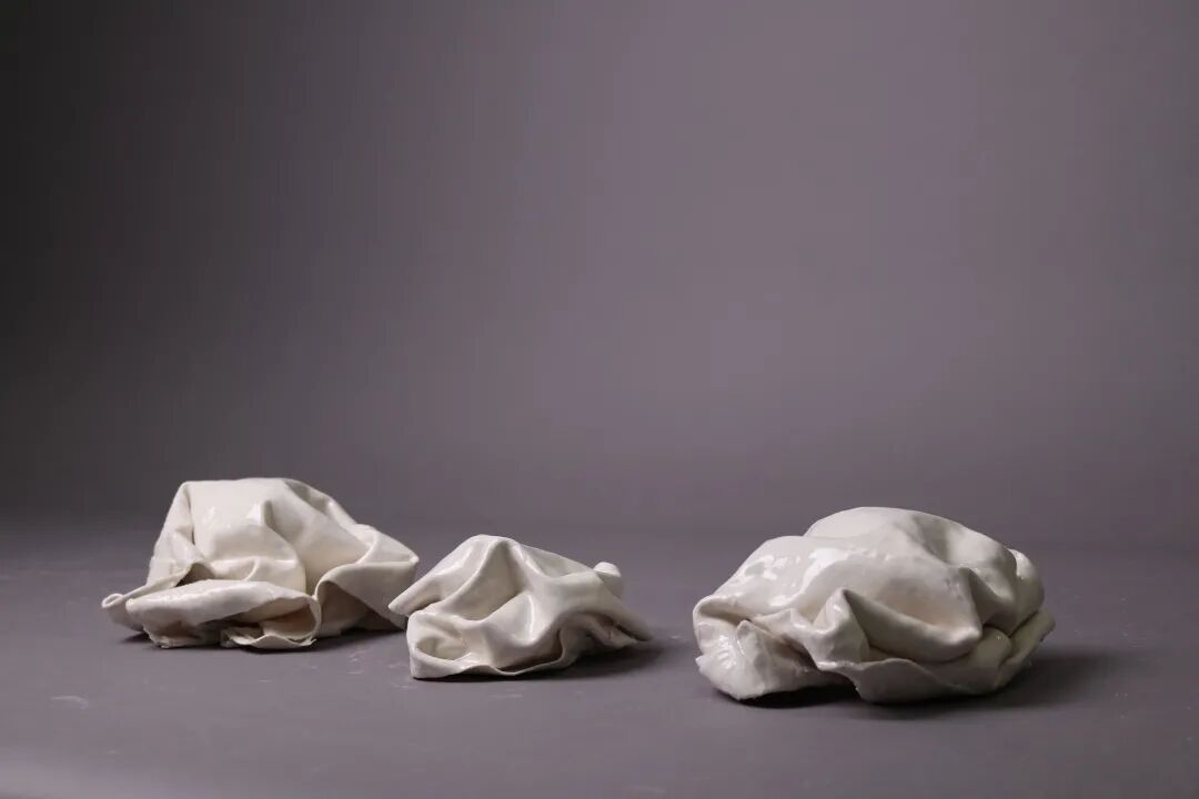 "Crumple" shows lines and surfaces produced by folding objects such as paper and fabric in the form of a flat ceramic board.