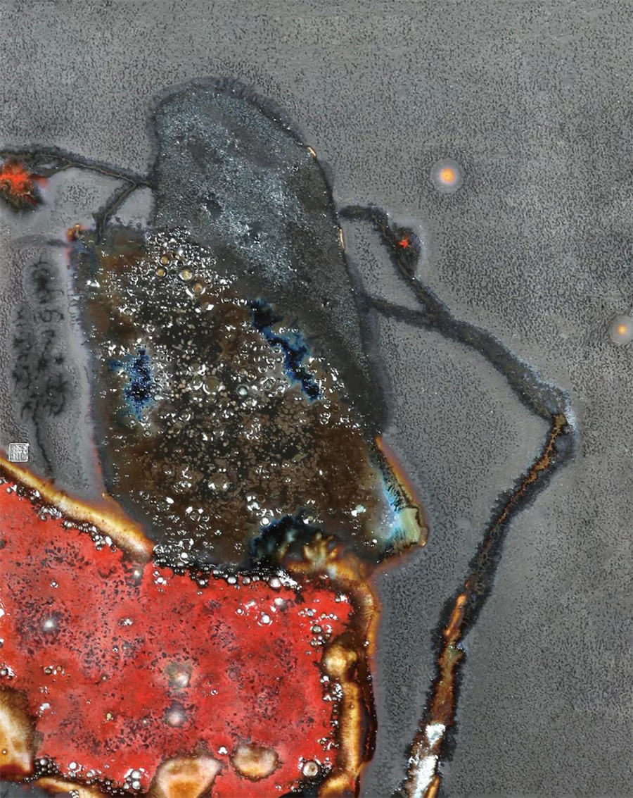 他的瓷画现在仍是以“水+墨”持续咀嚼前贤,如四僧、扬州八怪等,并以暗夜里的火,变之幻之,探索之,这其中,当然有成功的,也有不尽如人意处。然而,那些以素瓷或特殊釉色为底的小品,如大块而简洁的山,似乎与莫兰迪有相通处,读之如泛黄的旧纸,自有一种静谧,而在梅石的写意间,尤善于利用釉色与窑变,尤其是山石与花朵,一些窑变之作,真有“妙手偶得”之感,仿佛自苍古中来,所谓“入窑一色,出窑万彩”。